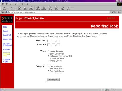4. We're still very unclear on the Reporting tools. Could you possibly give us a description of a scenario where you logged into a Project and wanted to use these tools. Let us know what options you'd expect to have, what kind of report you'd be running and what kind of results you want back ( please be specific on the format of these results ).